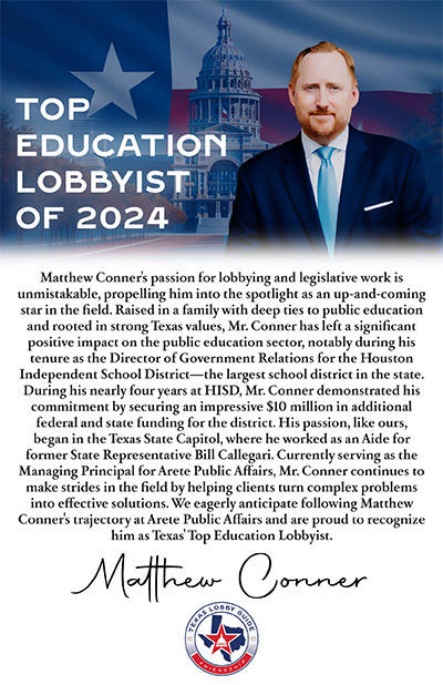 Texas Lobby Guide has unveiled their annual Spotlight Awards, recognizing Matthew Conner as the Top Education Lobbyist of 2024. The Texas Lobby Guide is the premier electronic directory for Texas lobbyists. The announcement of this award can be found on the Spotlights page of the Texas Lobby Guide website.